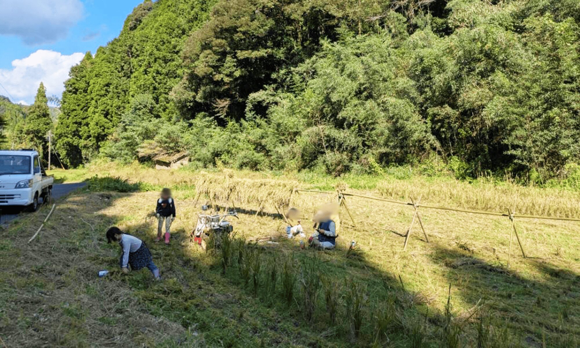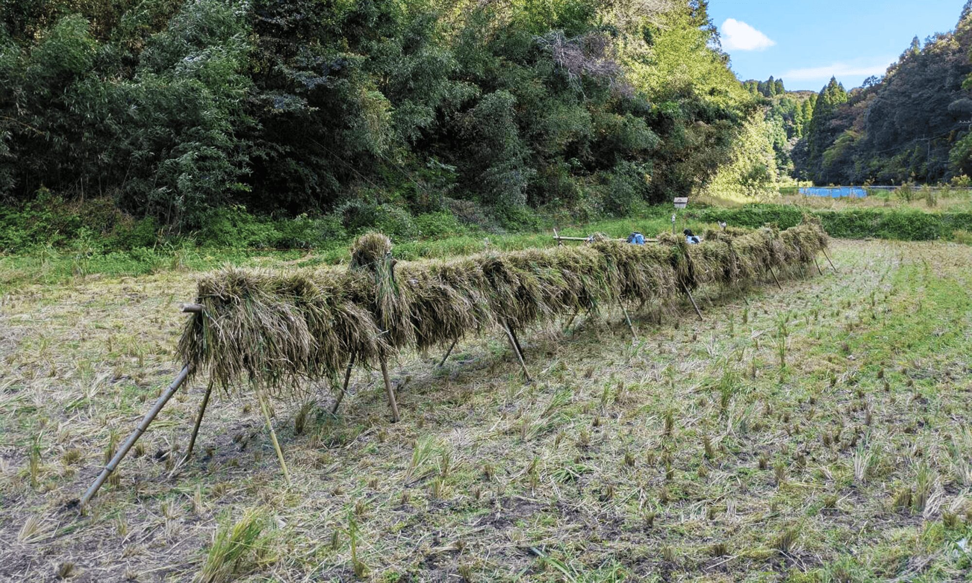 稲は掛け干しにするので、田んぼの真ん中から刈り取り、そこに竹を組んだ『ウマ』をつくる。